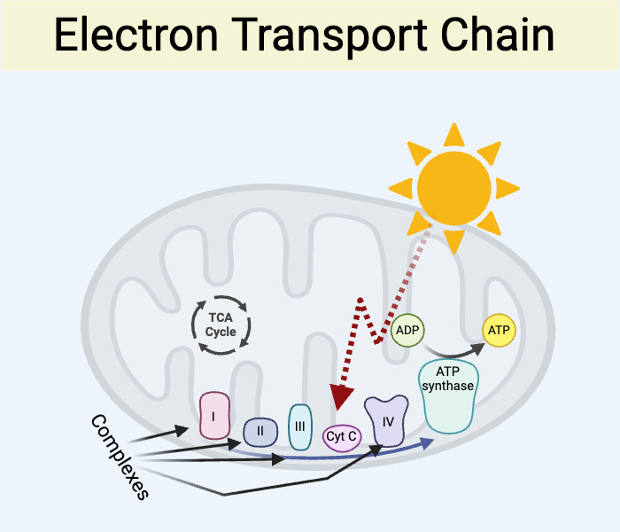 When it comes to light converting to cellular energy, we’re focusing on the electron transport chain. Within the inner membrane of the mitochondria are “complexes” that transport electrons and eventually produce ATP, which stores energy in a chemical bond that can be used at a later time in cellular processes that need energy.