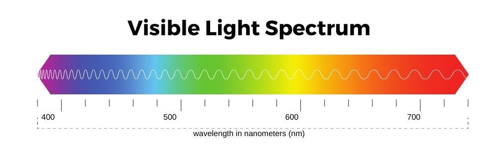 First, here’s a quick image showing the visual light spectrum and associated wavelengths: