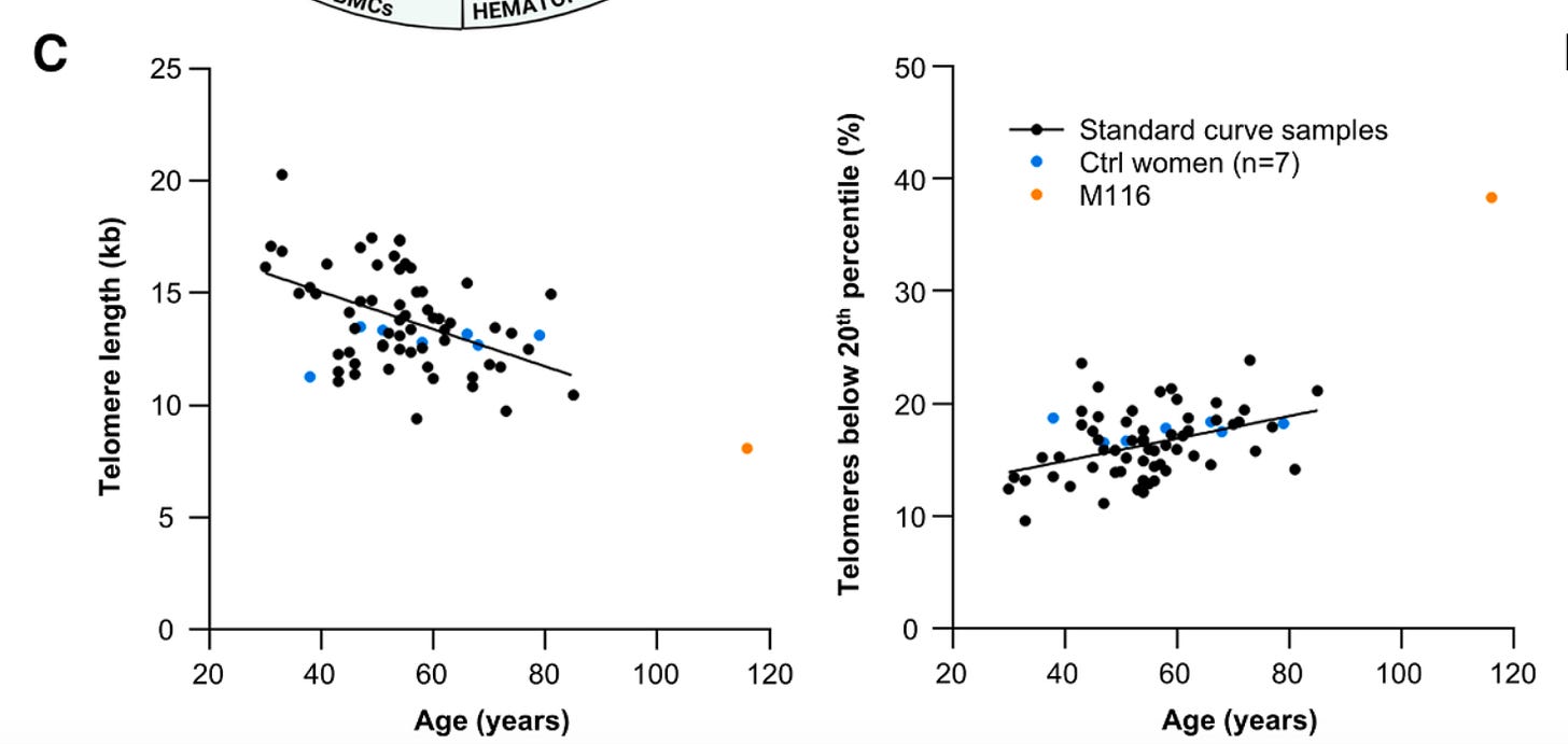 Telomeres: The end caps of chromosomes are called telomeres, and every time cells replicate and divide, the telomeres get a little shorter. For this supercentenarian, telomere length was very short, even in comparison with other older adults.