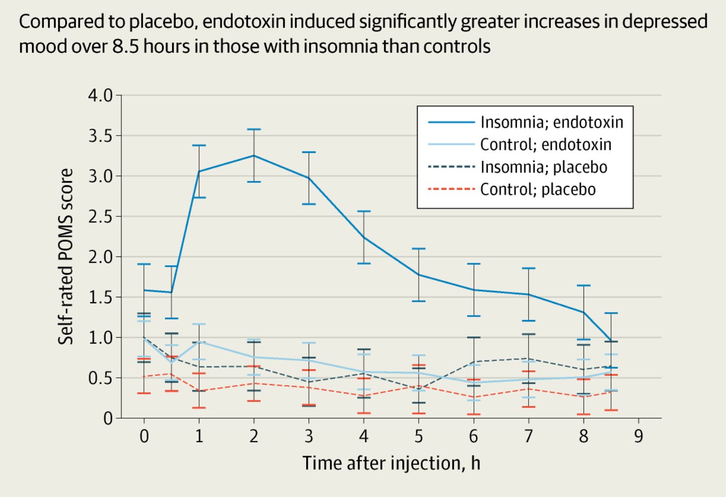 The study participants were 160 adults over age 60 who didn’t have depression. However, some of the participants had long-term problems with insomnia. They were randomized to receive either IV saline as a placebo or a shot of endotoxin. (I’m not sure that I would have signed up for a clinical trial with an endotoxin injection!)